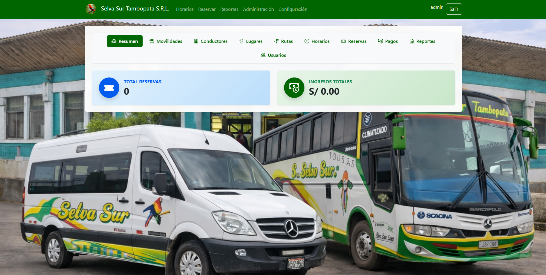 Sistema web desarrollada para la empresa Selva Sur Tambopata S.R.L., que permite gestionar la reserva y venta de pasajes en la ruta Julia...